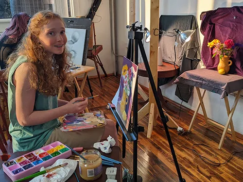 Our atelier approach, while similar in spirit to that for adults and teens is somewhat different. Children go straight to color and composition. Assignments for young children are based on creative themes. For example, we can ask them to paint Springtime in my Town by setting up a still life with various spring flowers and allowing them to make a scene using elements from observation and imagination. We introduce perspective, proportions, color mixing etc but within a highly creative and imaginative process. With young children we work mostly in pastels for color, but ask them to first draw their overall design in pencil. Acrylics and watercolors may also be used. Themes may include Seasons, Animals, My Room, My Town, My Garden, My family and My Self Portrait.